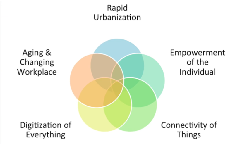 Upon returning from our first trip to Bangladesh back in 2013, we decided that we needed to focus our company thesis on building solutions and focusing efforts on opportunities that existed at the intersections of five megatrends, each of which is closely aligned to The Great Acceleration. These megatrends remain: